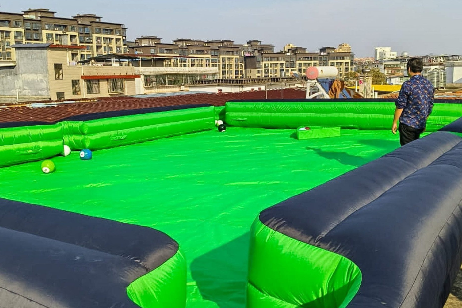 Auf einer beeindruckenden Fläche von 12 mal 8 Metern spielt Ihr Fußballbillard mit 16 speziellen Bällen